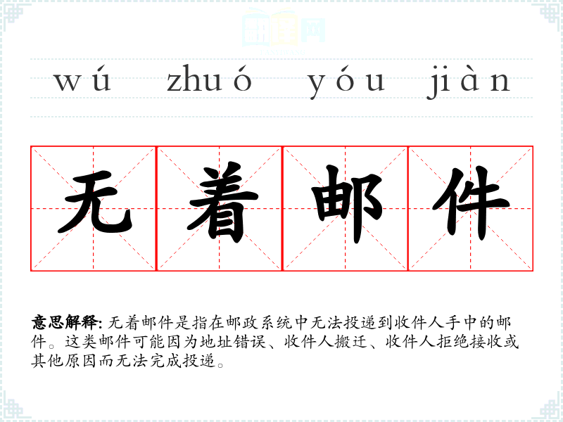 - 专业领域:在邮政和物流领域,无着邮件是一个专业术语,指的是那些无法投递的邮件,需要特殊处理。