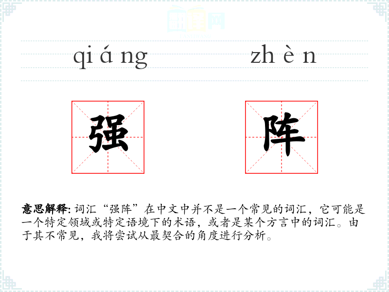 词汇“强阵”在中文中并不是一个常见的词汇,它可能是一个特定领域或特定语境下的术语,或者是某个方言中的词汇。由于其不常见,我将尝试从最契合的角度进行分析。