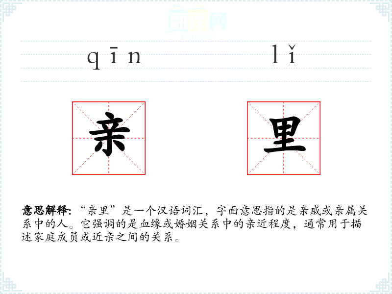 “亲里”是一个汉语词汇,字面意思指的是亲戚或亲属关系中的人。它强调的是血缘或婚姻关系中的亲近程度,通常用于描述家庭成员或近亲之间的关系。