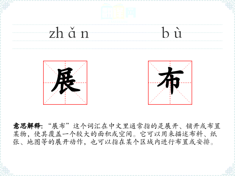 在**传统文化中,“展布”可能与节日的布置、庆典的准备等活动相关,体现了人们对美好生活的追求和细致的审美情趣。