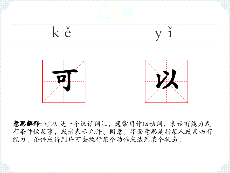 可以 是一个汉语词汇,通常用作助动词,表示有能力或有条件做某事,或者表示允许、同意。字面意思是指某人或某物有能力、条件或得到许可去执行某个动作或达到某个状态。