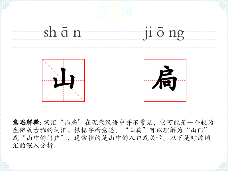 - 词源:山扃可能是由“山”和“扃”两个字组成,其中“扃”字古义为门闩或门户。