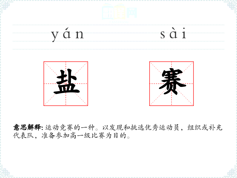 运动竞赛的一种。以发现和挑选优秀运动员,组织或补充代表队,准备参加高一级比赛为目的。
