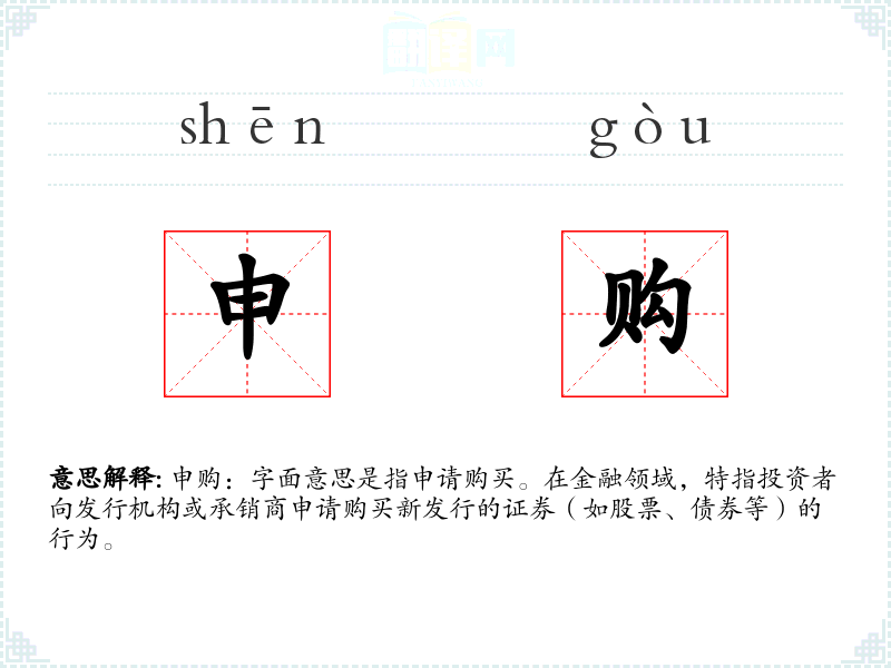 申购一词由“申”和“购”两个字组成。“申”有申请、陈述之意,“购”即购买。在金融领域,申购一词随着证券市场的发展而逐渐普及。