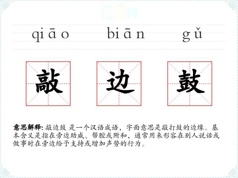 敲边鼓 是一个汉语成语,字面意思是敲打鼓的边缘。基本含义是指在旁边助威、帮腔或附和,通常用来形容在别人说话或做事时在旁边给予支持或增加声势的行为。
