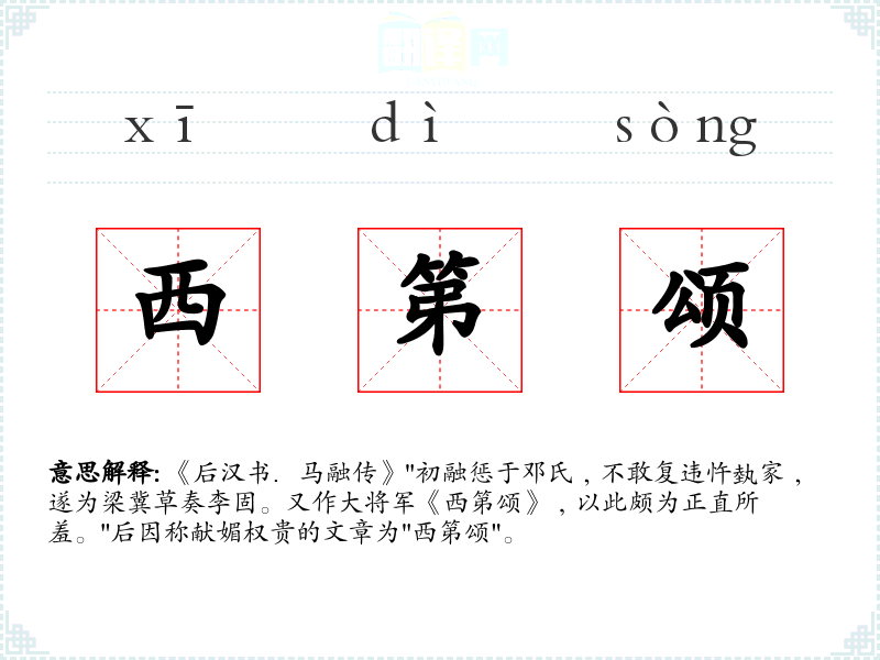 《后汉书.马融传》"初融惩于邓氏﹐不敢复违忤埶家﹐遂为梁冀草奏李固。又作大将军《西第颂》﹐以此颇为正直所羞。"后因称献媚权贵的文章为"西第颂"。
