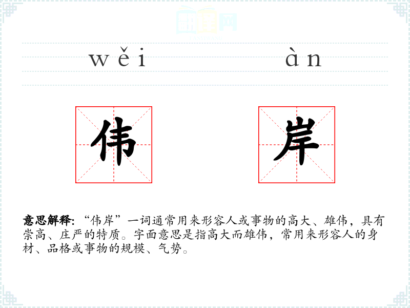- 文学:在文学作品中,“伟岸”常用来形容英雄人物或自然景观,如“他站在山巅,身影伟岸如松”。