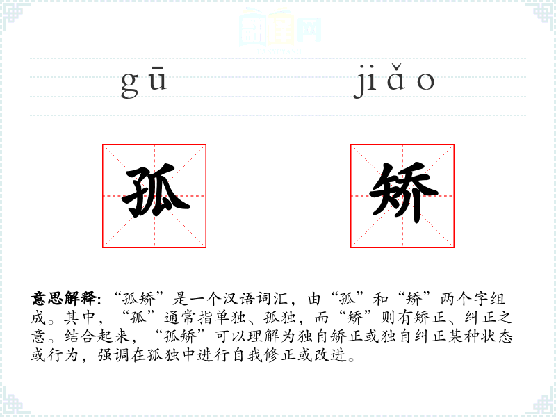 “孤矫”这个词在古代文献中并不常见,可能是近代或现代汉语中形成的词汇。它的构成体现了汉语中常见的通过组合已有词汇来创造新词的特点。