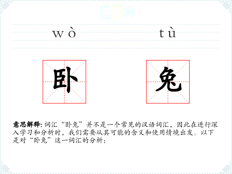 词汇“卧兔”并不是一个常见的汉语词汇,因此在进行深入学*和分析时,我们需要从其可能的含义和使用情境出发。以下是对“卧兔”这一词汇的分析: