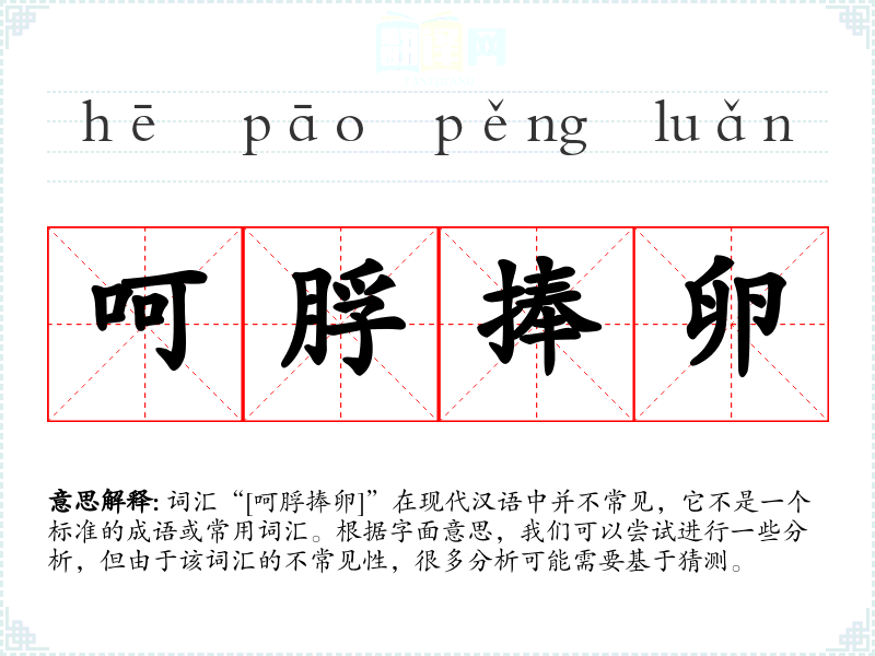 词汇“[呵脬捧卵]”在现代汉语中并不常见,它不是一个标准的成语或常用词汇。根据字面意思,我们可以尝试进行一些分析,但由于该词汇的不常见性,很多分析可能需要基于猜测。
