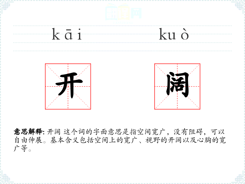 “开阔”这个词源于古代汉语,由“开”和“阔”两个字组成。在古代文献中,如《诗经》、《左传》中已有使用,随着时间的推移,其含义和用法逐渐丰富和扩展。