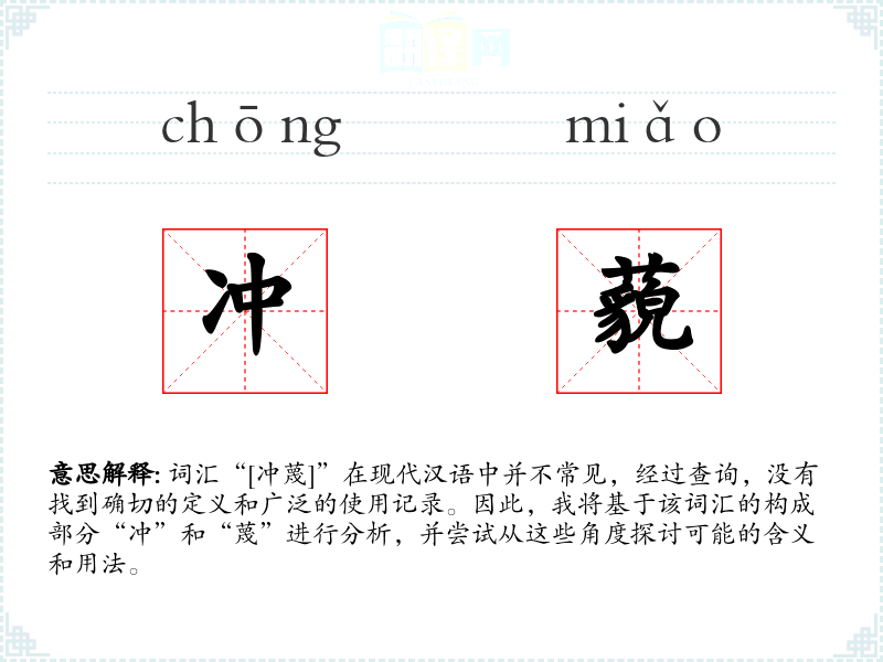 尽管“冲蔑”不是一个常用词汇,通过对其构成部分的理解,我们可以推测其可能的含义和用法。在语言学习和表达中,了解和掌握词汇的细微差别是非常重要的,即使是对不常见的词汇。