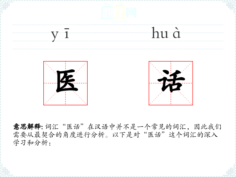 - 反义词:(由于“医话”不是一个常用词汇,反义词可能不明显)