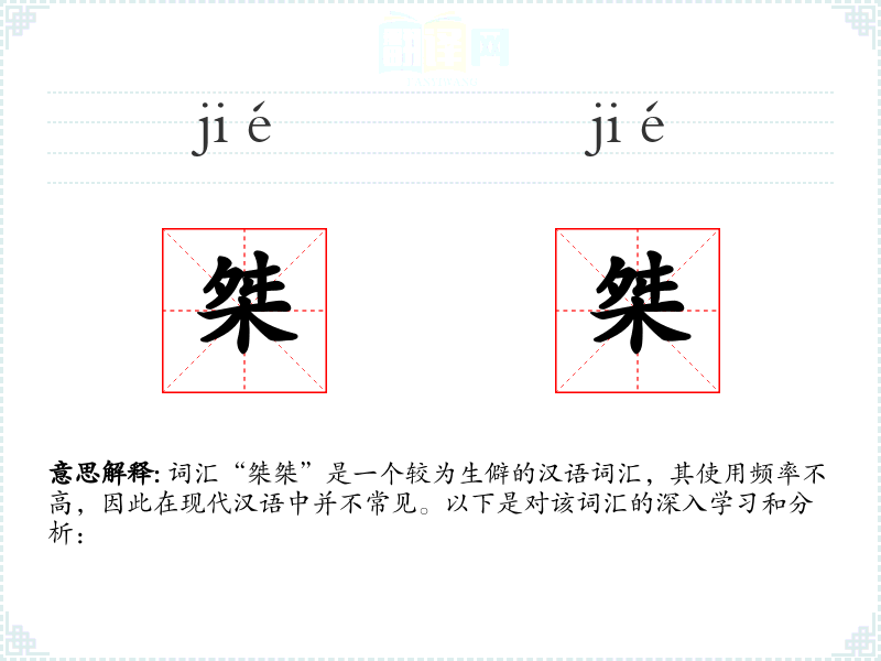 词汇“桀桀”是一个较为生僻的汉语词汇,其使用频率不高,因此在现代汉语中并不常见。以下是对该词汇的深入学*和分析: