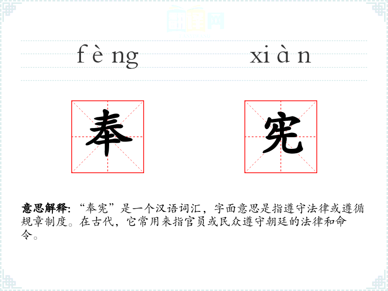 “奉宪”一词源自古代汉语,其中“奉”意为接受、遵守,“宪”指法律、规章。随着时间的推移,这个词汇的含义基本保持不变,但在现代汉语中使用频率有所下降。