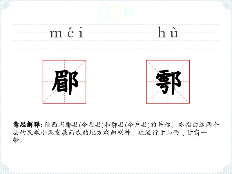 陕西省郿县(今眉县)和鄠县(今户县)的并称。亦指由这两个县的民歌小调发展而成的地方戏曲剧种。也流行于山西﹑甘肃一带。