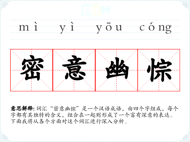 词汇“密意幽悰”是一个汉语成语,由四个字组成,每个字都有其独特的含义,组合在一起则形成了一个富有深意的表达。下面我将从各个方面对这个词汇进行深入分析。
