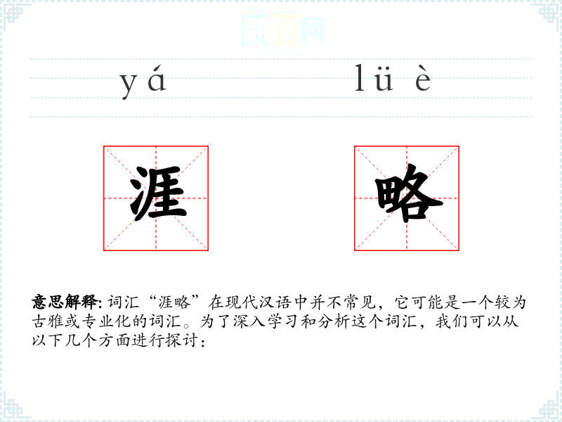 词汇“涯略”在现代汉语中并不常见,它可能是一个较为古雅或专业化的词汇。为了深入学*和分析这个词汇,我们可以从以下几个方面进行探讨: