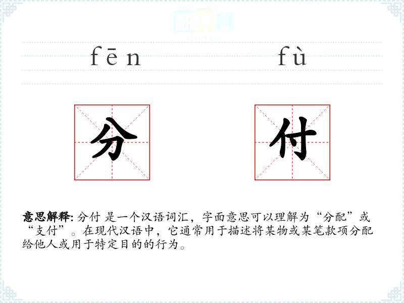 分付 是一个汉语词汇,字面意思可以理解为“分配”或“支付”。在现代汉语中,它通常用于描述将某物或某笔款项分配给他人或用于特定目的的行为。