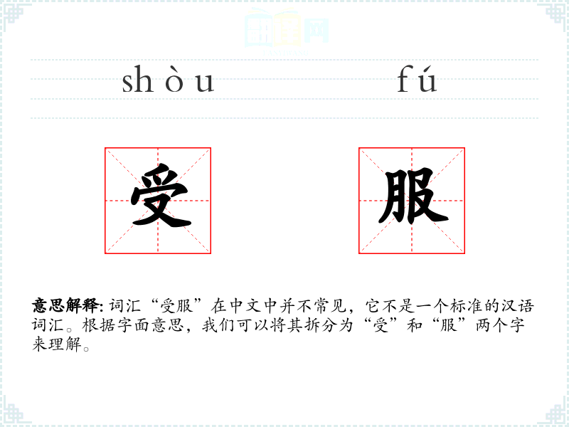 词汇“受服”在中文中并不常见,它不是一个标准的汉语词汇。根据字面意思,我们可以将其拆分为“受”和“服”两个字来理解。