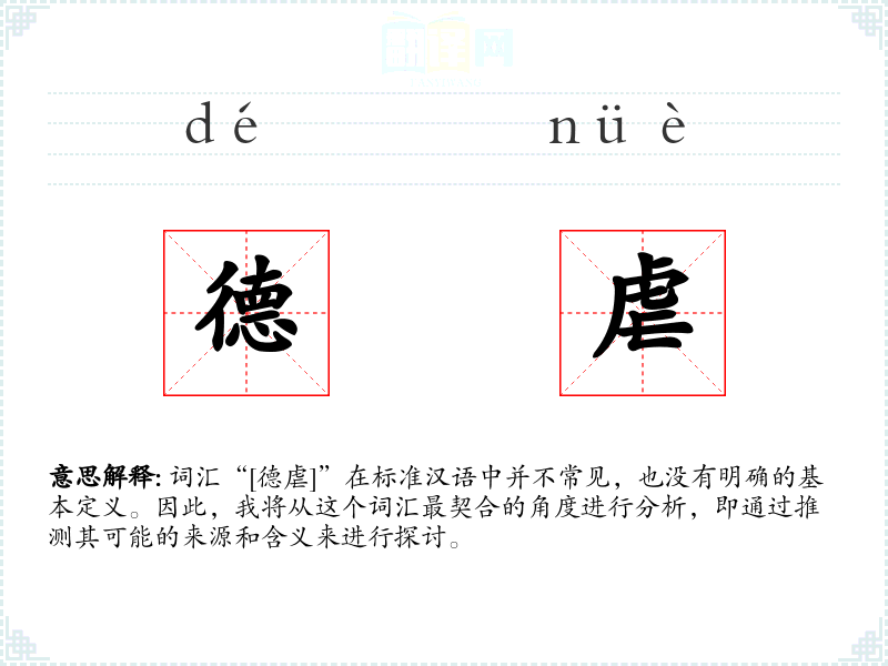 词汇“[德虐]”在标准汉语中并不常见,也没有明确的基本定义。因此,我将从这个词汇最契合的角度进行分析,即通过推测其可能的来源和含义来进行探讨。
