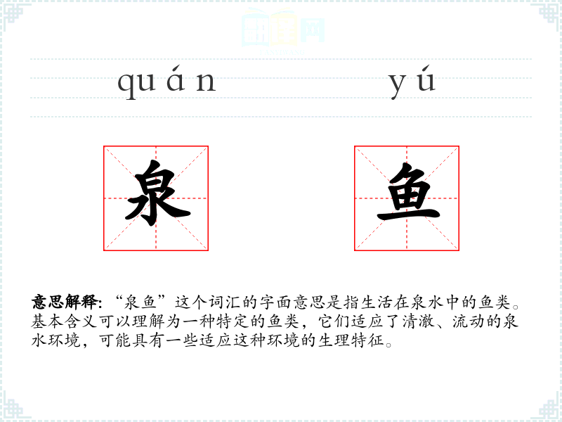 - 反义词:海鱼(指生活在海洋中的鱼类,与泉鱼的生活环境截然不同)