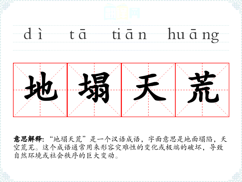 “地塌天荒”是一个汉语成语,字面意思是地面塌陷,天空荒芜。这个成语通常用来形容灾难性的变化或极端的破坏,导致自然环境或社会秩序的巨大变动。