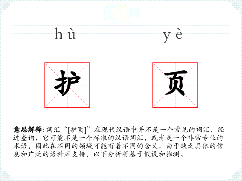 词汇“[护页]”在现代汉语中并不是一个常见的词汇,经过查询,它可能不是一个标准的汉语词汇,或者是一个非常专业的术语,因此在不同的领域可能有着不同的含义。由于缺乏具体的信息和广泛的语料库支持,以下分析将基于假设和推测。