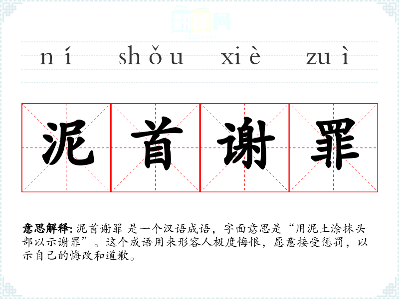 泥首谢罪 是一个汉语成语,字面意思是“用泥土涂抹头部以示谢罪”。这个成语用来形容人极度悔恨,愿意接受惩罚,以示自己的悔改和道歉。