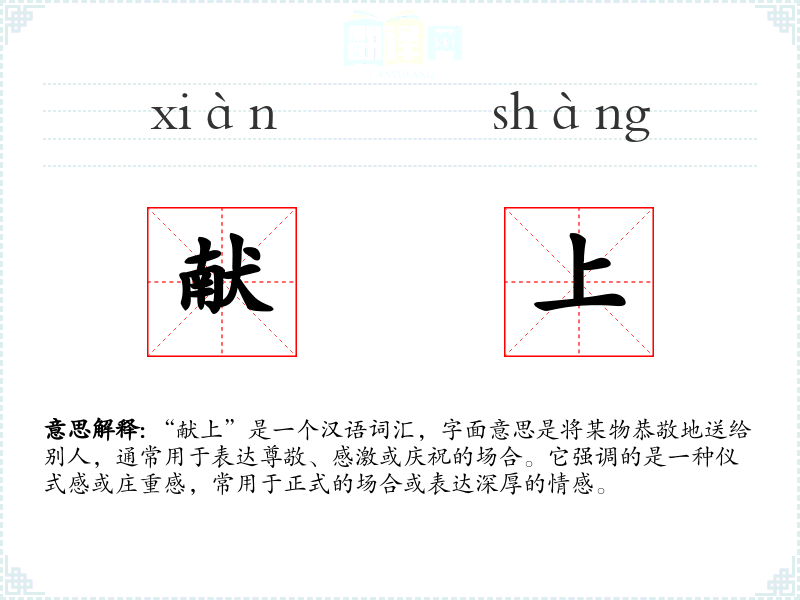 “献上”是一个汉语词汇,字面意思是将某物恭敬地送给别人,通常用于表达尊敬、感激或庆祝的场合。它强调的是一种仪式感或庄重感,常用于正式的场合或表达深厚的情感。