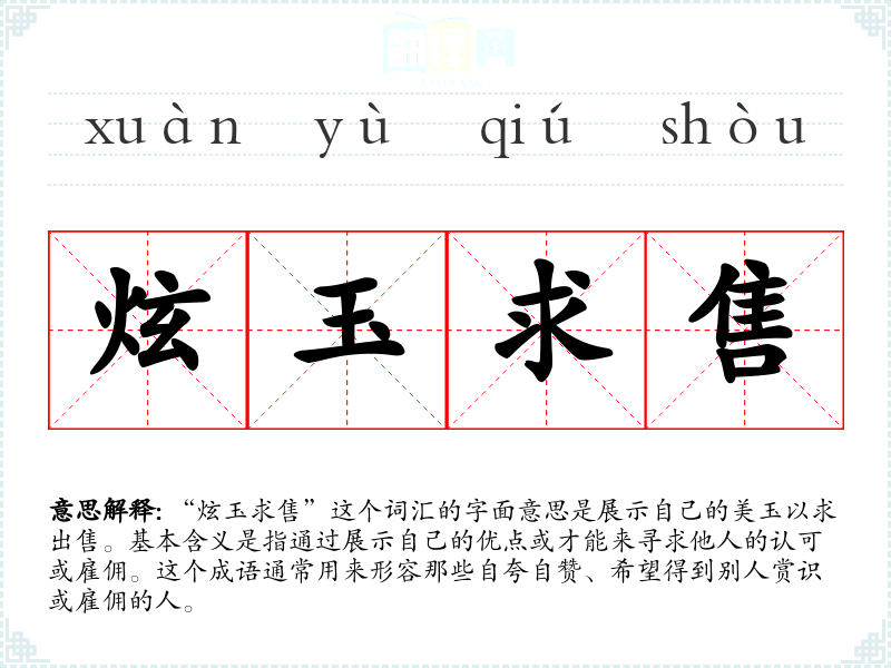 “炫玉求售”这个词汇的字面意思是展示自己的美玉以求出售。基本含义是指通过展示自己的优点或才能来寻求他人的认可或雇佣。这个成语通常用来形容那些自夸自赞、希望得到别人赏识或雇佣的人。