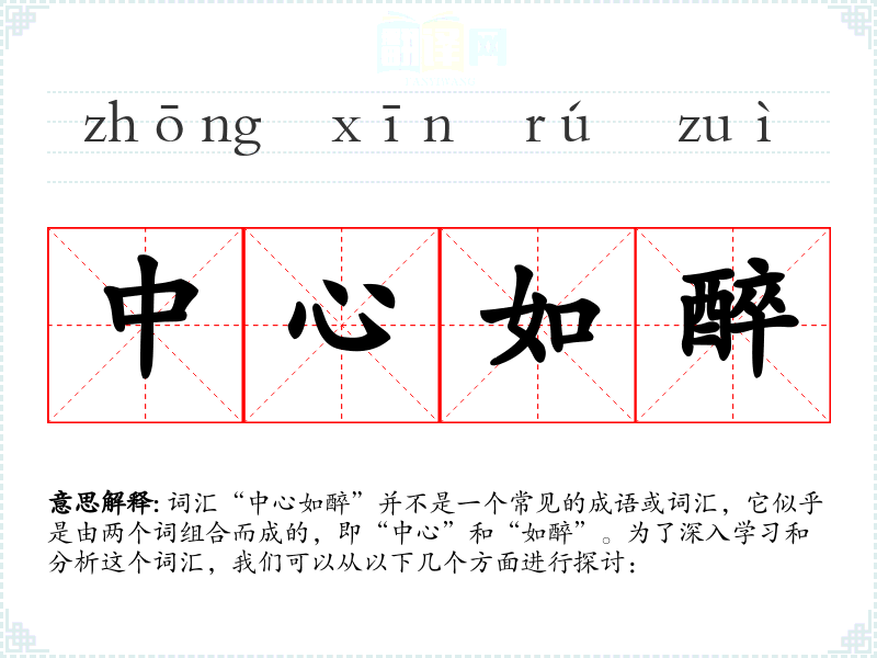 - “中心如醉”这个词汇虽然不常见,但它提供了一种形象的表达方式,用来形容一种深度的情感投入和精神上的满足。在语言学*和表达中,了解和运用这样的词汇可以丰富我们的表达方式,增强语言的生动性和表现力。
