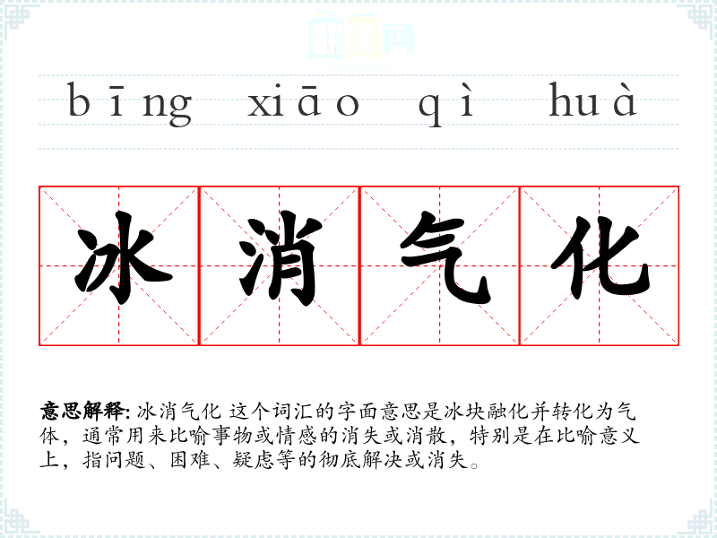 冰消气化 这个词汇的字面意思是冰块融化并转化为气体,通常用来比喻事物或情感的消失或消散,特别是在比喻意义上,指问题、困难、疑虑等的彻底解决或消失。