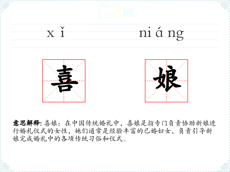 - 词源:喜娘一词源于**传统文化,其中“喜”代表喜庆和幸福,“娘”则是对女性的尊称。