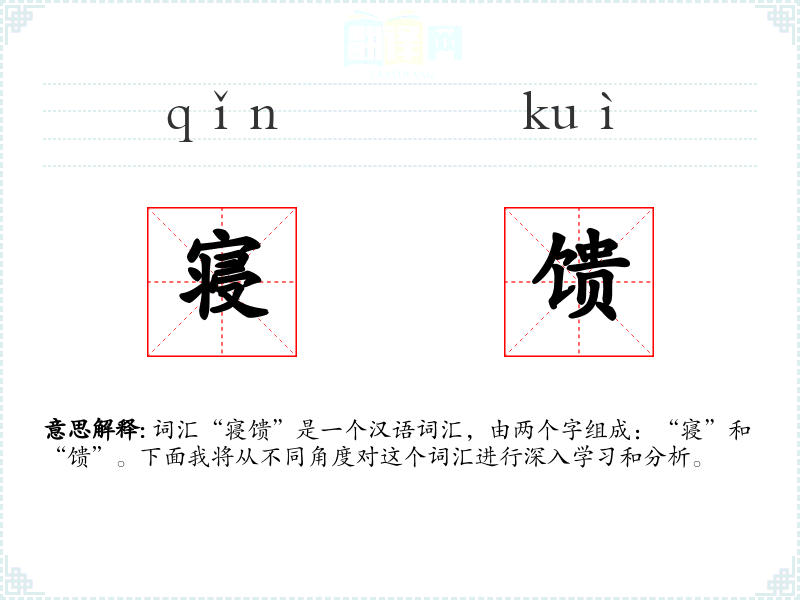 词汇“寝馈”是一个汉语词汇,由两个字组成:“寝”和“馈”。下面我将从不同角度对这个词汇进行深入学*和分析。