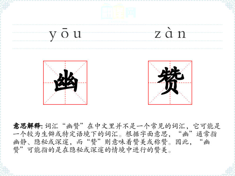 由于“幽赞”是一个较为生僻的词汇,它在不同语言或文化中的对应词汇可能不太明确。在其他语言中,可能需要寻找类似的表达方式来传达类似的情感。