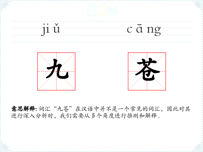 由于“九苍”不是一个常用词汇,它在不同语境下的使用可能较为有限。在文学作品中,它可能被用来形容极高的天空或深邃的宇宙,赋予作品以宏大的背景或神秘的氛围。在口语或专业领域中,这个词汇可能不太常见。