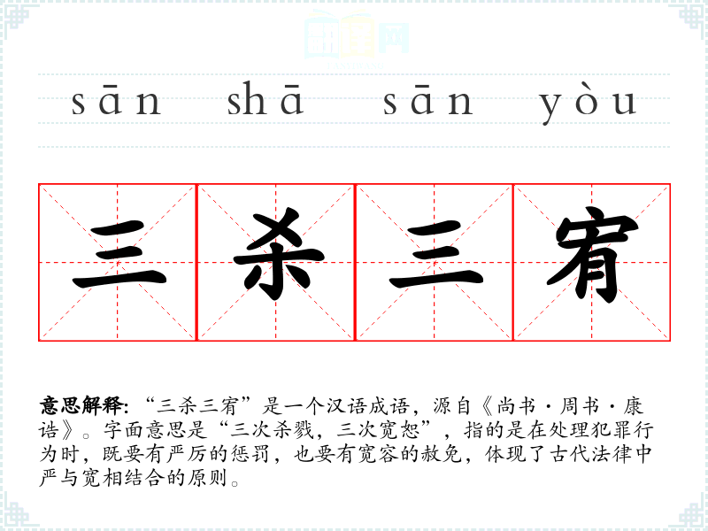 “三杀三宥”是一个汉语成语,源自《尚书·周书·康诰》。字面意思是“三次杀戮,三次宽恕”,指的是在处理犯罪行为时,既要有严厉的惩罚,也要有宽容的赦免,体现了古代法律中严与宽相结合的原则。