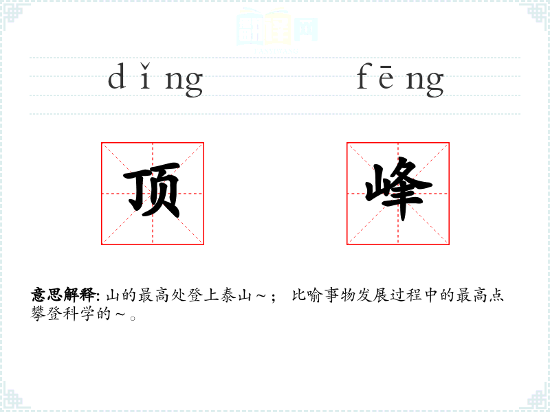 山的最高处登上泰山~; 比喻事物发展过程中的最高点攀登科学的~。