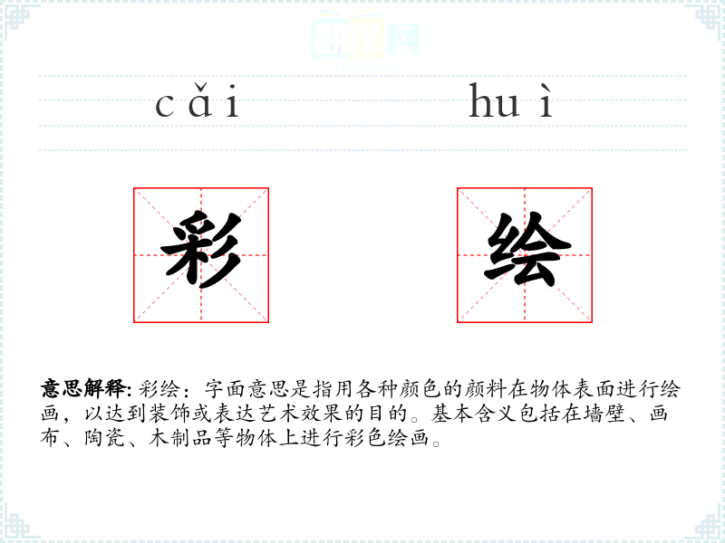 彩绘:字面意思是指用各种颜色的颜料在物体表面进行绘画,以达到装饰或表达艺术效果的目的。基本含义包括在墙壁、画布、陶瓷、木制品等物体上进行彩色绘画。