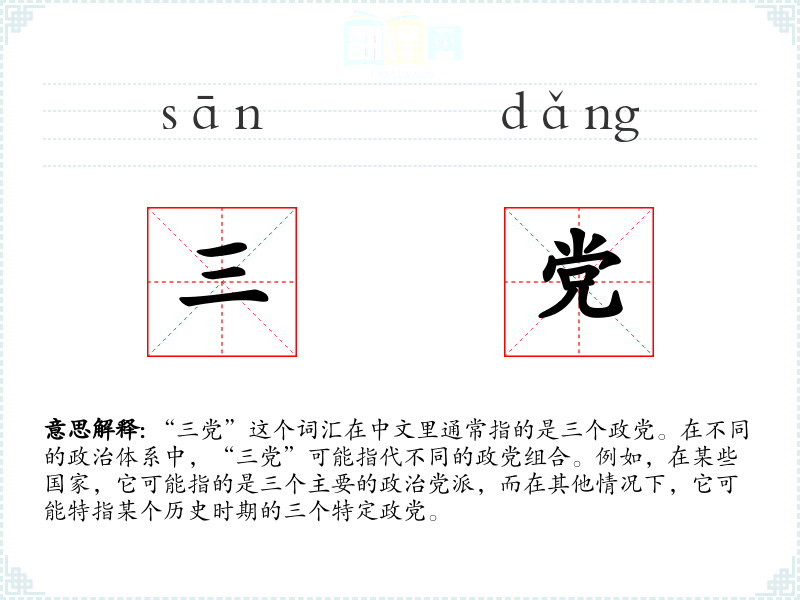 “三党”这个词汇在中文里通常指的是三个政党。在不同的政治体系中,“三党”可能指代不同的政党组合。例如,在某些国家,它可能指的是三个主要的政治党派,而在其他情况下,它可能特指某个历史时期的三个特定政党。