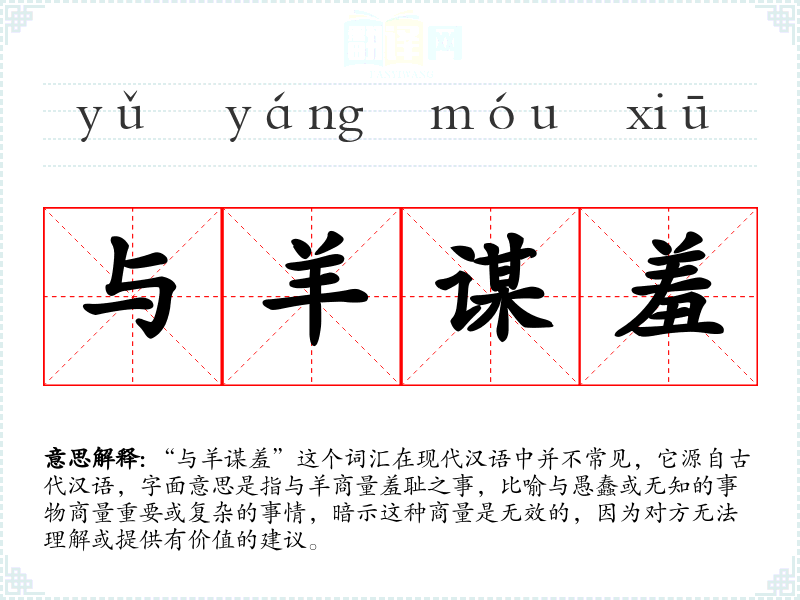 “与羊谋羞”这个词汇在现代汉语中并不常见,它源自古代汉语,字面意思是指与羊商量羞耻之事,比喻与愚蠢或无知的事物商量重要或复杂的事情,暗示这种商量是无效的,因为对方无法理解或提供有价值的建议。