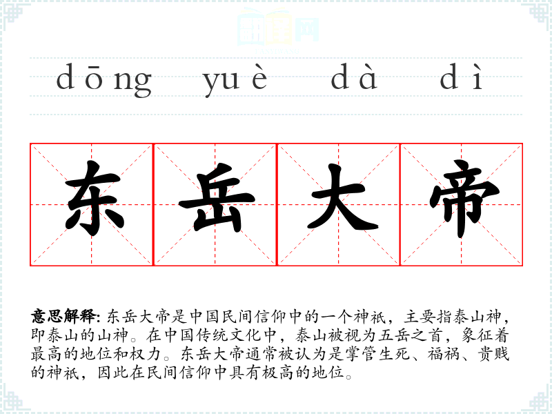 在文学作品中,东岳大帝常被用来象征权威和神圣,如古代诗词中常提及的“东岳”即指泰山,而“东岳大帝”则是对泰山神的尊称。在口语中,提及东岳大帝通常带有敬畏之情,尤其是在讨论与命运、生死相关的话题时。在专业领域,如**学、民俗学中,东岳大帝是一个重要的研究对象,涉及其历史、神话、祭祀仪式等方面的研究。