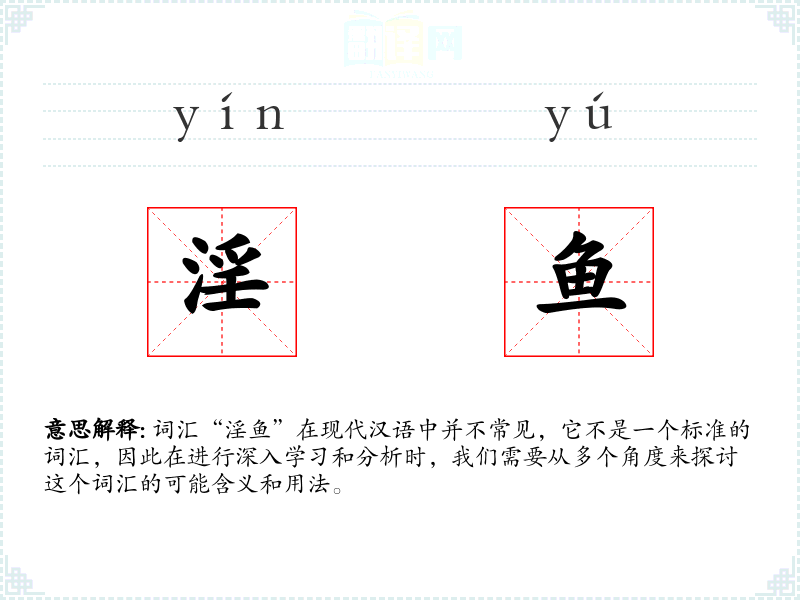 “淫”字在古代汉语中有多重含义,包括过度、放纵等。而“鱼”则是指鱼类。将这两个字组合在一起,可能是为了形容某种鱼类的特殊行为。然而,这个词汇并没有在历史文献中留下明确的记录,因此其词源和演变难以考证。