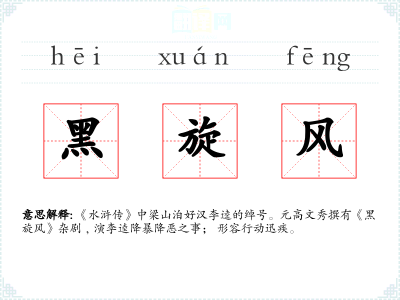 《水浒传》中梁山泊好汉李逵的绰号。元高文秀撰有《黑旋风》杂剧﹐演李逵降暴降恶之事; 形容行动迅疾。