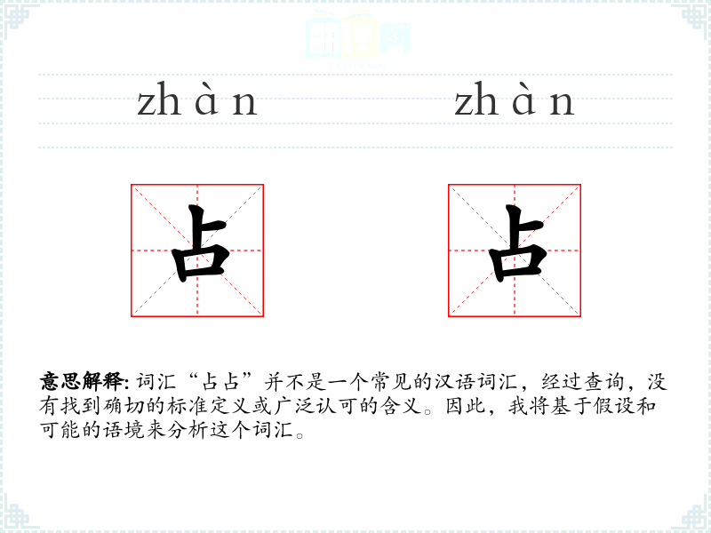 由于“占占”不是一个标准词汇,我们无法对其进行深入分析。在语言学习中,了解和掌握标准词汇是非常重要的,这有助于我们更好地理解和表达。对于不常见的词汇,我们应该通过可靠的资源来验证其含义和用法。