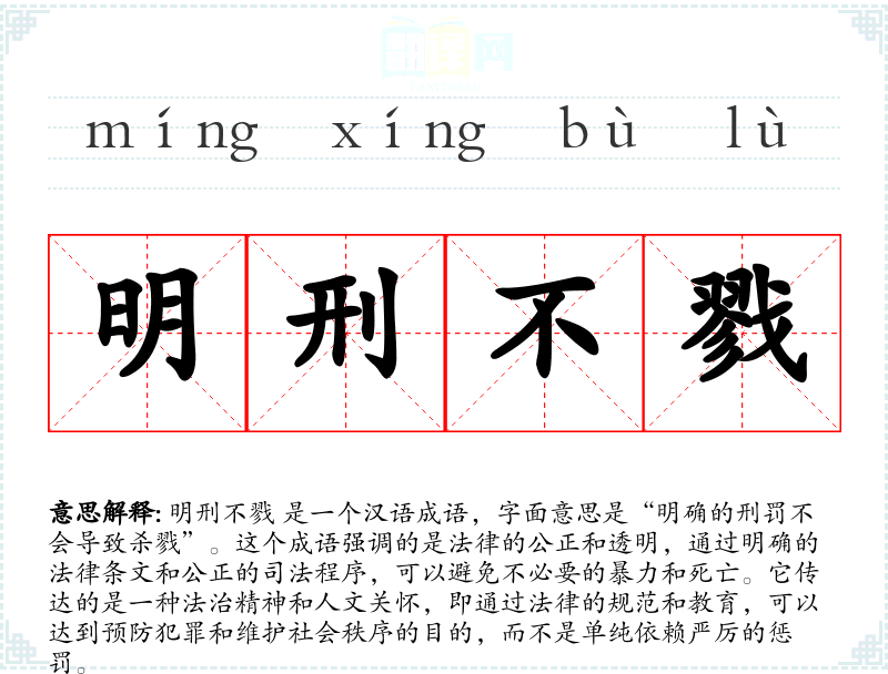 明刑不戮 是一个汉语成语,字面意思是“明确的刑罚不会导致杀戮”。这个成语强调的是法律的公正和透明,通过明确的法律条文和公正的司法程序,可以避免不必要的暴力和死亡。它传达的是一种法治精神和人文关怀,即通过法律的规范和教育,可以达到预防犯罪和维护社会秩序的目的,而不是单纯依赖严厉的惩罚。