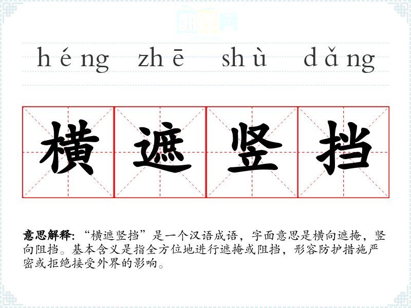 “横遮竖挡”是一个汉语成语,字面意思是横向遮掩,竖向阻挡。基本含义是指全方位地进行遮掩或阻挡,形容防护措施严密或拒绝接受外界的影响。