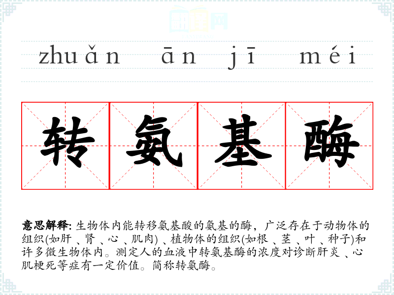 1.生物体内能转移氨基酸的氨基的酶,广泛存在于动物体的组织(如肝﹑肾﹑心﹑肌肉)﹑植物体的组织(如根﹑茎﹑叶﹑种子)和许多微生物体内。测定人的血液中转氨基酶的浓度对诊断肝炎﹑心肌梗死等症有一定价值。简称转氨酶。
