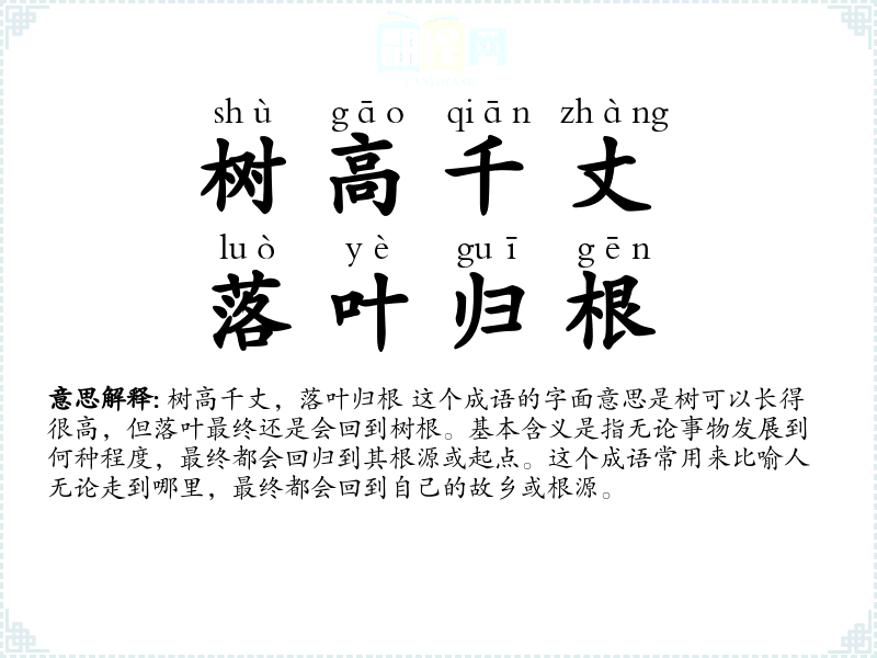 树高千丈,落叶归根 这个成语的字面意思是树可以长得很高,但落叶最终还是会回到树根。基本含义是指无论事物发展到何种程度,最终都会回归到其根源或起点。这个成语常用来比喻人无论走到哪里,最终都会回到自己的故乡或根源。